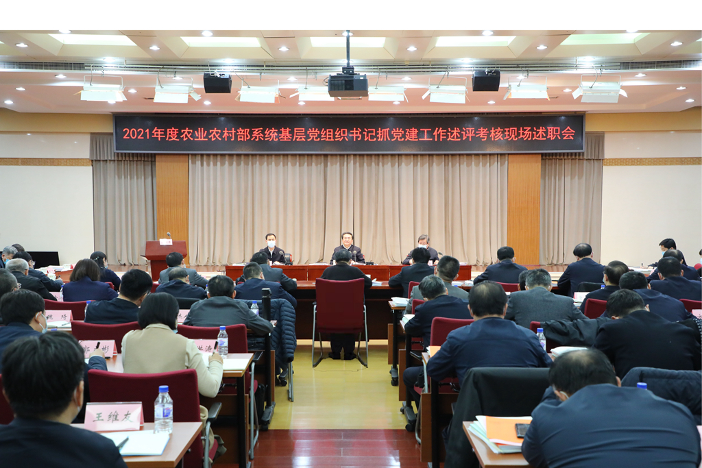 近日,农业农村部召开2021年度基层党组织书记抓党建工作述职评议考核现场述职会。部党组成员、副部长邓小刚出席会议,对现场述职的党组织书记、纪委书记2021年工作进行点评,并作总结讲话。驻部纪检监察组组长、部党组成员吴清海对全面从严治党工作提出明确要求。部党组成员、人事司司长廖西元主持会议。会议强调,部系统各级党组织要更加紧密地团结在以习近平同志为核心的党中央周围,弘扬伟大建党精神,扎实推进党的建设高质量发展,以实际行动迎接党的二十大胜利召开。